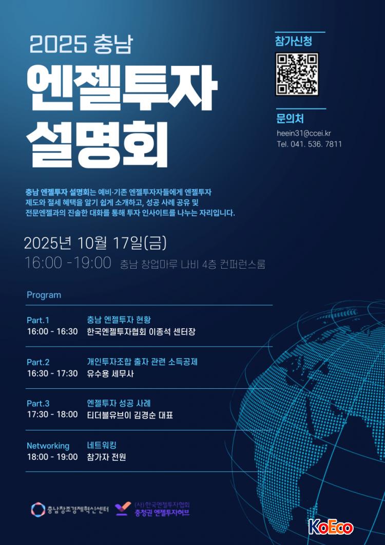 Çà»ç´Â 2025³â 10¿ù 17ÀÏ(±Ý) ¿ÀÈÄ 4½ÃºÎÅÍ 7½Ã±îÁö Ãæ³² â¾÷¸¶·ç ³ªºñ 4Ãþ ÄÁÆÛ·±½º·ë¿¡¼ °³ÃֵǸç, Ãæ³² ¿£Á©ÅõÀÚ ÇöȲ, °³ÀÎÅõÀÚÁ¶ÇÕ ÃâÀÚ °ü·Ã ¼Òµæ°øÁ¦, ¿£Á©ÅõÀÚ ¼º°ø »ç·Ê µîÀÇ °Àǰ¡ ÁøÇàµÈ´Ù. °ÀÇ ÈÄ¿¡´Â ÀÚÀ¯·Ó°Ô ÀǰßÀ» ³ª´ ¼ö ÀÖ´Â ³×Æ®¿öÅ· ½Ã°£µµ ¸¶·ÃµÈ´Ù.