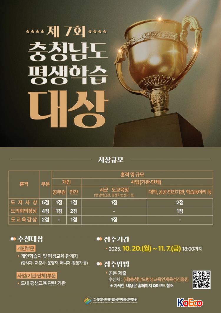 [ÄÚ¸®¾ÆÀΰæÁ¦½Å¹®/±³À°] Ȳ½Å¹Î ±âÀÚ = Ãæ³²Æò»ý±³À°ÀÎÀçÀ°¼ºÁøÈï¿ø(¿øÀå ȲȯÅÃ)Àº¡®2025³â Á¦7ȸ Ãæ³² Æò»ýÇнÀ´ë»ó¡¯Ç¥Ã¢ °ø¸ð¸¦ ½Ç½ÃÇÑ´Ù°í 23ÀÏ ¹àÇû´Ù. À̹ø °ø¸ð´Â Æò»ýÇнÀ¿¡ ´ëÇÑ ¿Á¤°ú Çå½ÅÀ¸·Î Áö¿ª»çȸ ÇнÀ¹®È È®»ê¿¡ ±â¿©ÇÑ µµ¹Î°ú ±â°ü¡¤´Üü¸¦ ¹ß±¼ÇØ ±× °ø·Î¸¦ ³Î¸® ¾Ë¸®°íÀÚ ÃßÁøµÈ´Ù.