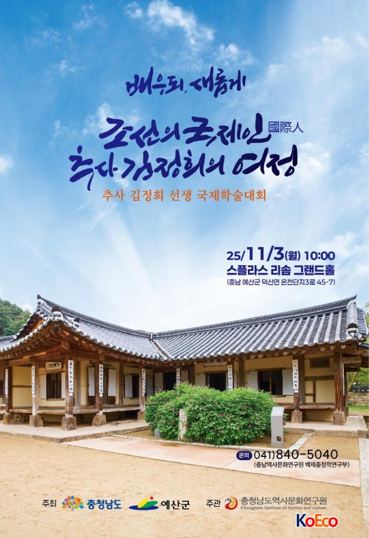 [ÄÚ¸®¾ÆÀΰæÁ¦½Å¹®/»çȸ] Ȳ½Å¹Î ±âÀÚ = Ãæ³²¿ª»ç¹®È¿¬±¸¿ø(¿øÀå Àå±â½Â)ÀÌ ÁÖ°üÇϰí ÃæÃ»³²µµ(µµÁö»ç ±èÅÂÈì)¿Í ¿¹»ê±º(±º¼ö ÃÖÀ籸)ÀÌ °øµ¿À¸·Î ÁÖÃÖÇÏ´Â Ãß»ç ±èÁ¤Èñ ¼±»ý ±¹Á¦Çмú´ëȸ°¡ ¿À´Â 2025³â 11¿ù 3ÀÏ(¿ù) 10½Ã ½ºÇÃ¶ó½º ¸®¼Ø ±×·£µåȦ¿¡¼ °³ÃֵȴÙ.