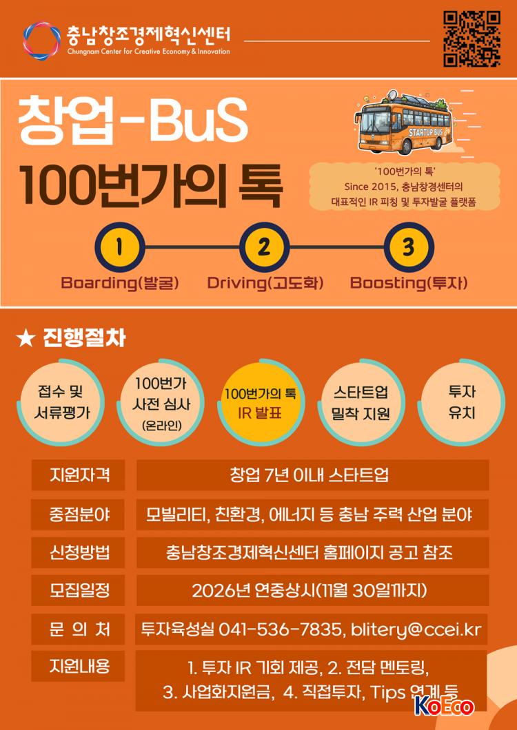 [ÄÚ¸®¾ÆÀΰæÁ¦½Å¹®/°æÁ¦] ±èÁ¤Çö ±âÀÚ = (Àç)Ãæ³²Ã¢Á¶°æÁ¦Çõ½Å¼¾ÅÍ(ÀÌÇÏ Ãæ³²Çõ½Å¼¾ÅÍ)°¡ Áö¿ª ³» À¯¸Á ½ºÅ¸Æ®¾÷ÀÇ ½Å¼ÓÇÑ ¹ß±¼°ú ½ÇÁúÀûÀÎ ÅõÀÚ À¯Ä¡¸¦ Áö¿øÇϱâ À§ÇØ 2026 â¾÷-BuS ¡®100¹ø°¡ÀÇ Å塯 ÇÁ·Î±×·¥¿¡ Âü¿©ÇÒ ±â¾÷À» »ó½Ã ¸ðÁýÇÑ´Ù°í ¹àÇû´Ù.