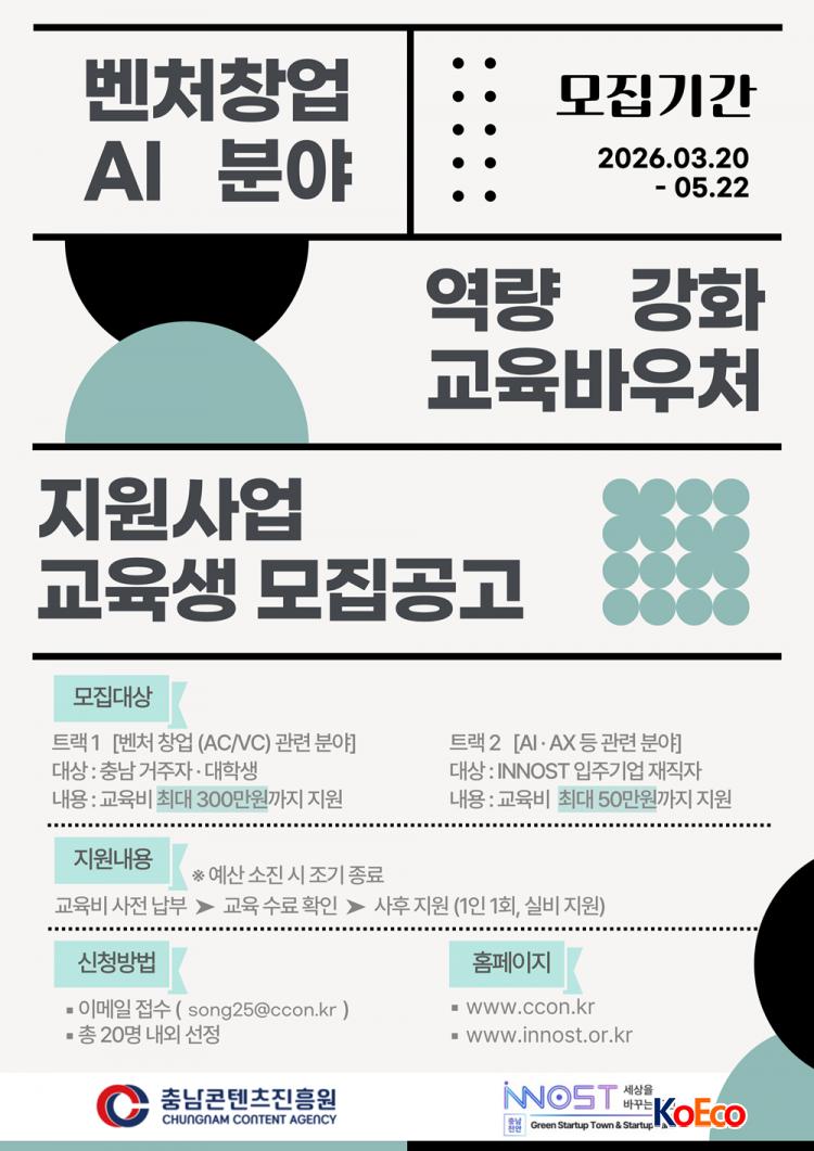 [ÄÚ¸®¾ÆÀΰæÁ¦½Å¹®/»çȸ] Ȳ½Å¹Î ±âÀÚ = Ãæ³²ÄÜÅÙÃ÷ÁøÈï¿ø(¿øÀå ±è°î¹Ì, ÀÌÇÏ ÁøÈï¿ø)Àº ¿À´Â 5¿ù 22ÀϱîÁö ¡®º¥Ã³Ã¢¾÷¡¤AIºÐ¾ß ¿ª·®°È ±³À° ¹Ù¿ìó Áö¿ø»ç¾÷¡¯ Âü¿©ÀÚ¸¦ ¸ðÁýÇÑ´Ù°í ¹àÇû´Ù.