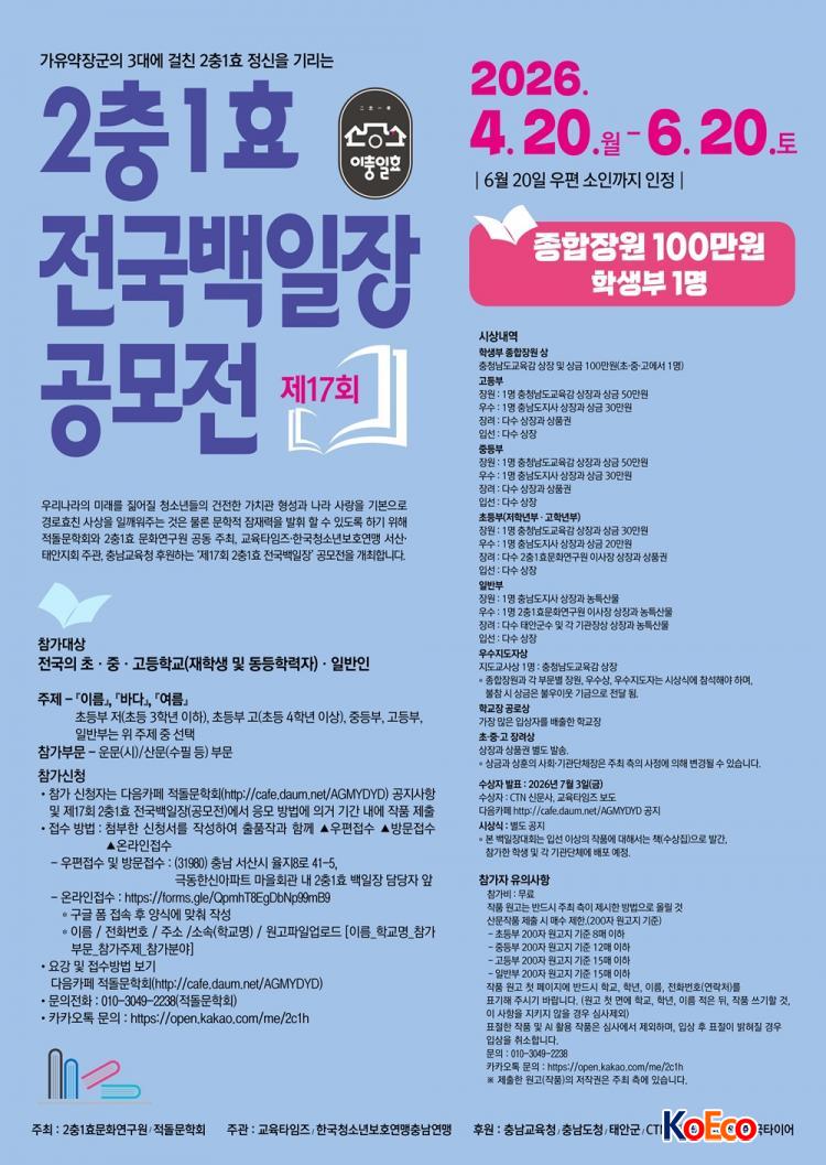 Àûµ¹¹®ÇÐȸ¿Í 2Ãæ1È¿¹®È¿¬±¸¿øÀÌ °øµ¿ ÁÖÃÖÇÏ°í ±³À°Å¸ÀÓÁî, Çѱ¹Ã»¼Ò³âº¸È£¿¬¸Í Ãæ³²¿¬¸ÍÀÌ ÁÖ°üÇÏ´Â À̹ø °ø¸ðÀüÀº ¿À´Â 4¿ù 20ÀϺÎÅÍ 6¿ù 20ÀϱîÁö µÎ ´Þ°£ ÀÛǰÀ» Á¢¼öÇÑ´Ù.